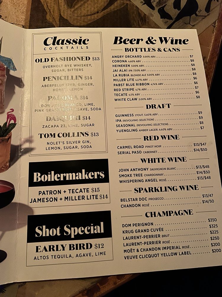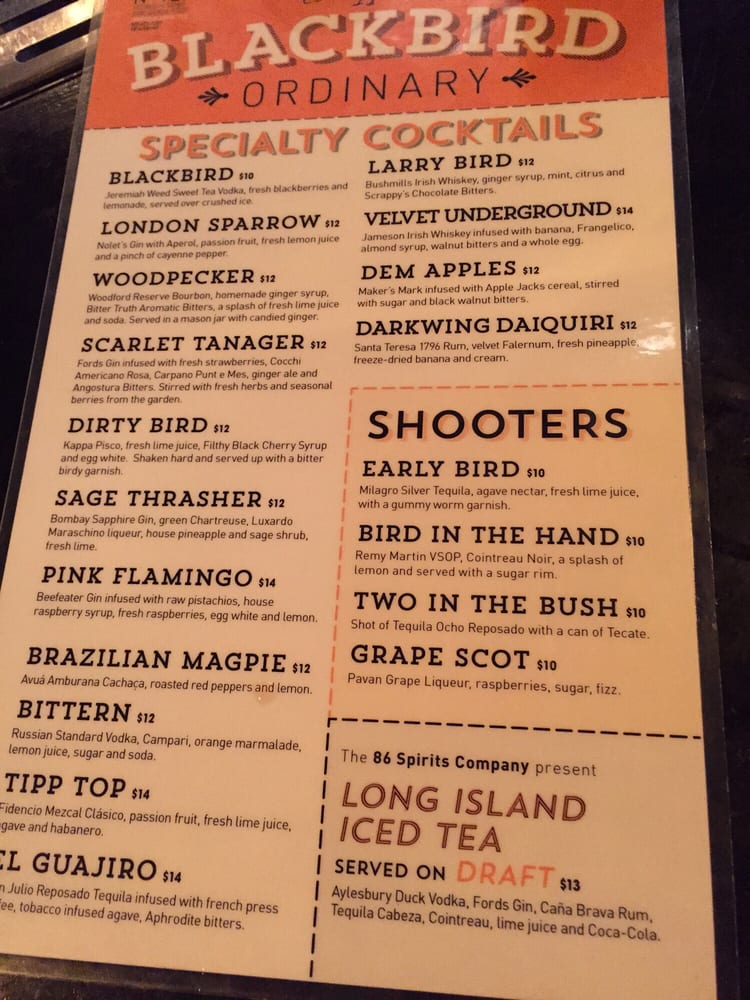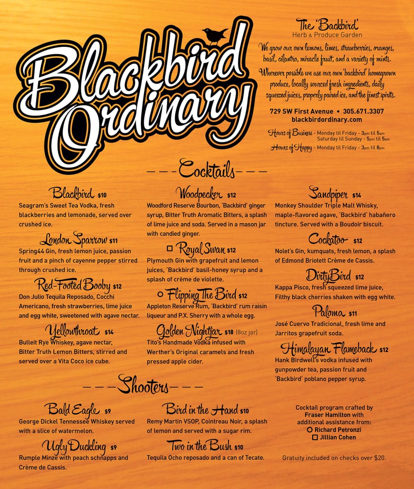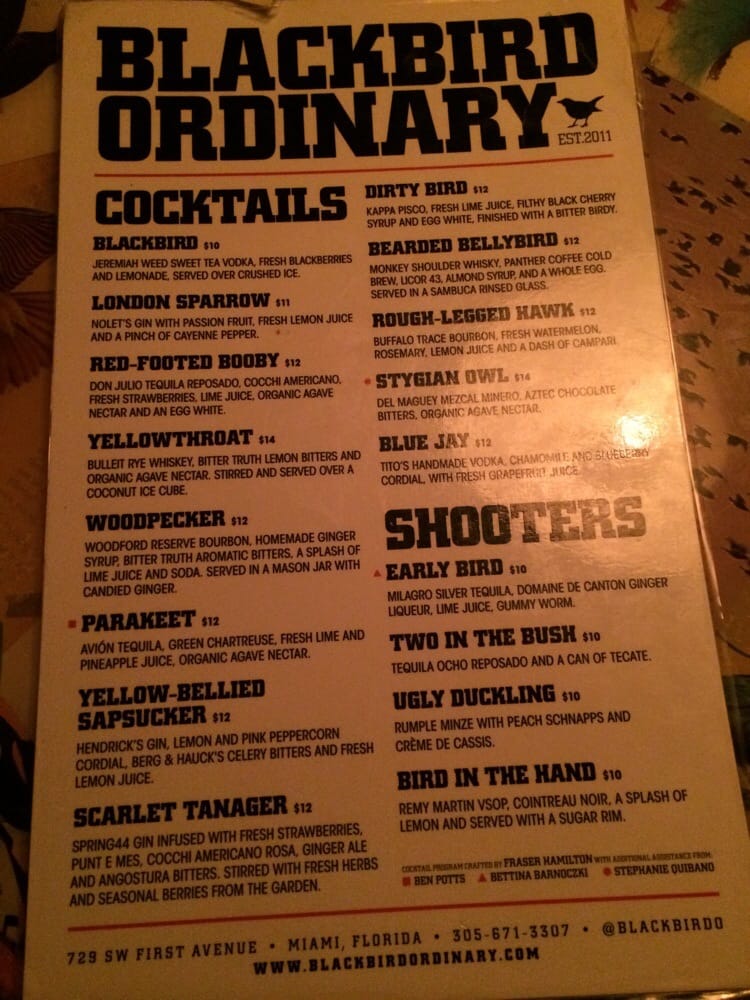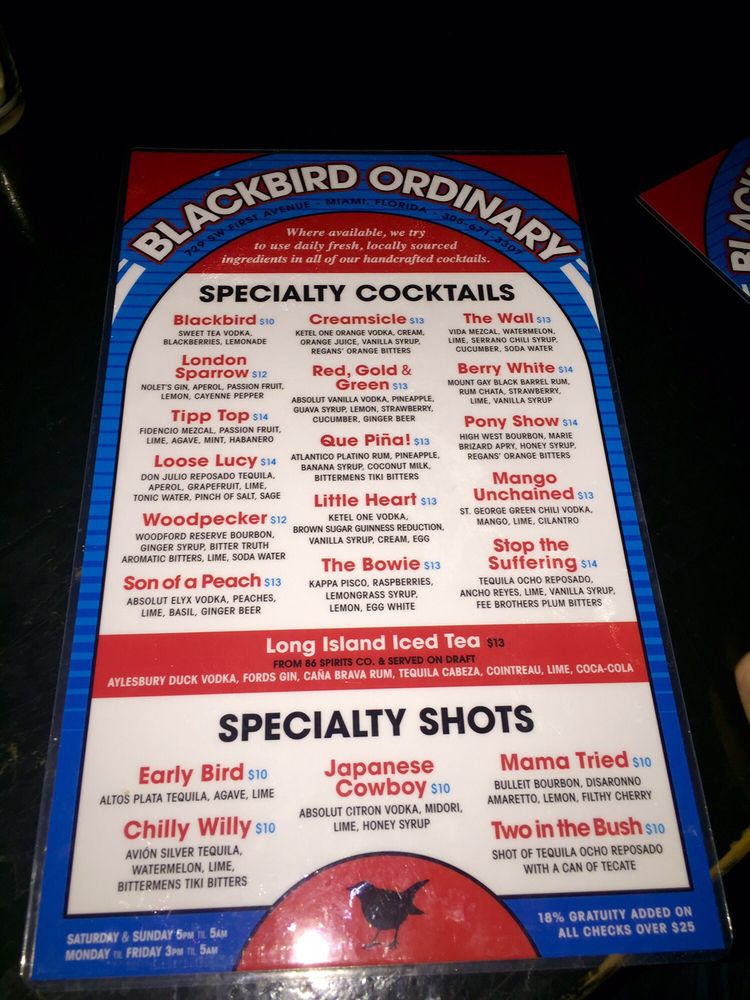 Introducing the menu at Blackbird Ordinary, Miami's go-to cocktail bar for a fun night out. With a hip and casual atmosphere, this bar offers happy hour specials every day from 3-8pm, making it a perfect place to unwind with friends. Customers rave about the delicious drinks served by friendly bartenders, with favorites like the Blackbird and Henessey old fashion. The club-like vibe with music, pool tables, and dancing makes it a popular spot on weekends. Ladies night on Tuesdays offers free drinks until 1AM, and the unique cocktail options like the Seagrams sweet tea vodka Blackbird are a hit. While parking in downtown Miami can be limited, the overall experience and strong drinks at Blackbird Ordinary are worth a visit. Enjoy the different music genres, lively crowd, and unforgettable nights at this must-visit spot in Miami.